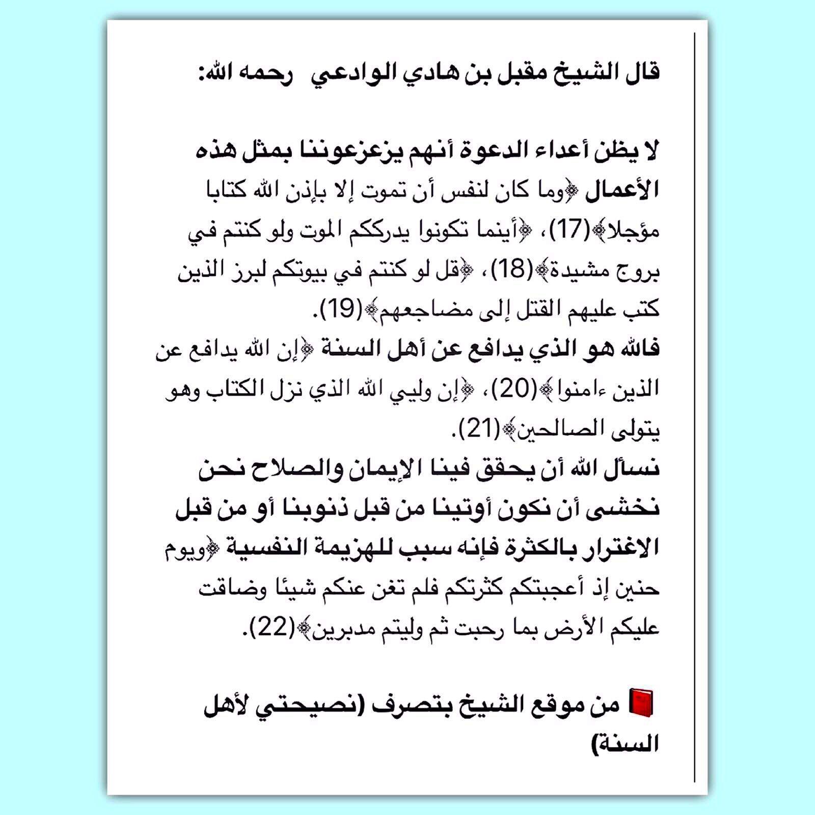 كبار علماء أهل السنة No Twitter قال الشيخ مقبل بن هادي الوادعي رحمه الله لا يظن أعداء الدعوة أنهم يزعزعوننا بمثل هذه الأعمال وما كان لنفس أن تموت إلا بإذن الله كتابا