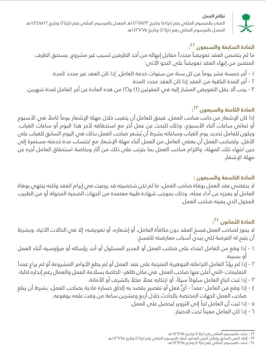 المادة السابعة والسبعون. المادة السابعة والسبعون من نظام العمل السعودي مالم يتضمن العقد تعويضا محددا مقابل انهائه من احد الطرفين لسبب غير مشروع يستحق الطرف المتضرر امن انهاء العقد تعويضا على النحو الاتي. 2 الهيئة العليا لتسوية الخلافات. 3 شرح مادة 77 من نظام العمل السعودي 2020.