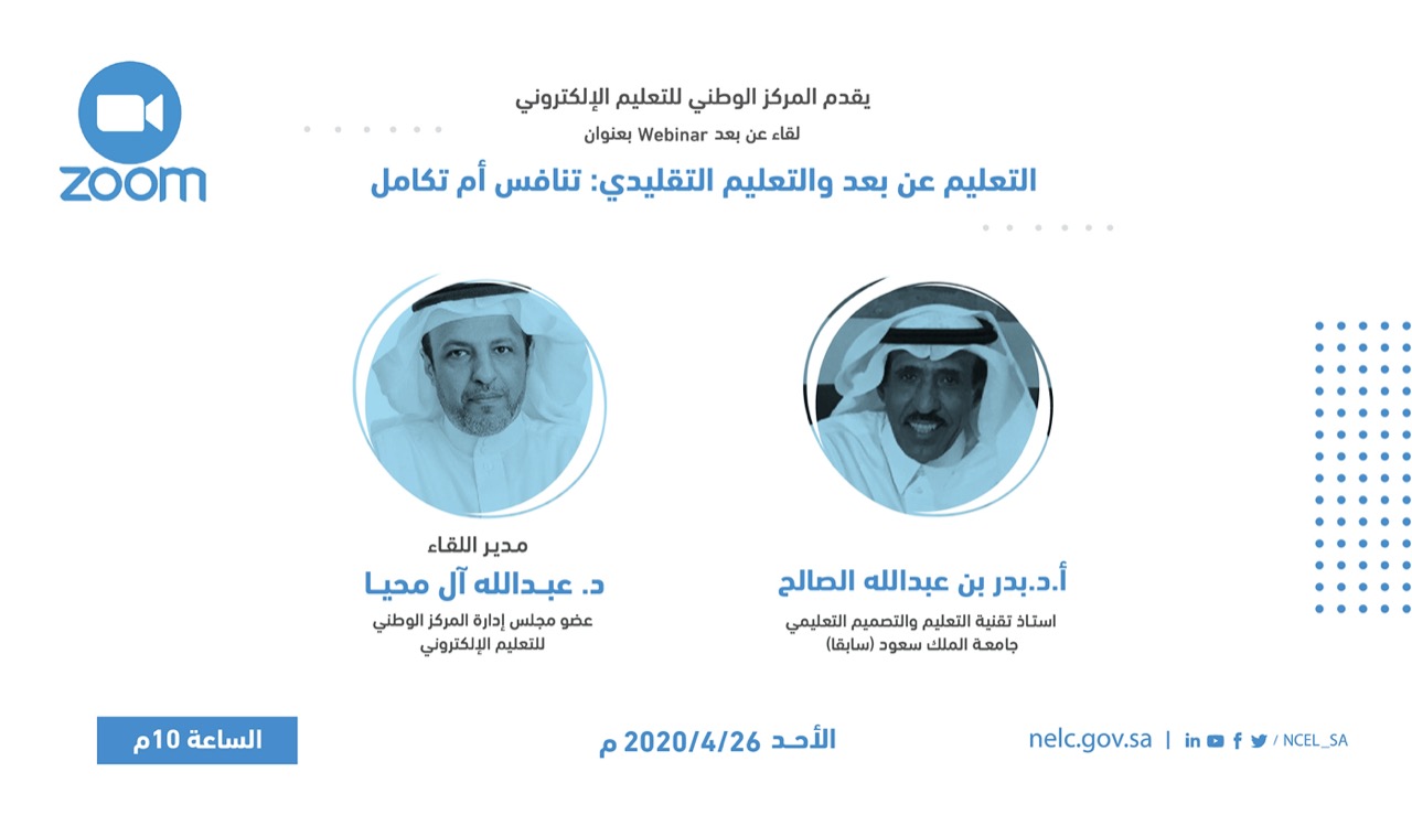 المركز الوطني للتعلم الإلكتروني والتعليم عن بعد. جميع الحقوق محفوظة للمركز الوطني للتعليم الإلكتروني 2020م. التعليم عن بعد والتعليم التقليدي. الاثنين 2020 04 20 منصات البرنامج الوطني للمحتوى التعليمي المفتوح أدوارها الحالية والمستقبلية الأحد 2020 04 19. عزام بن محمد الدخيل مساء اليوم المؤتمر.