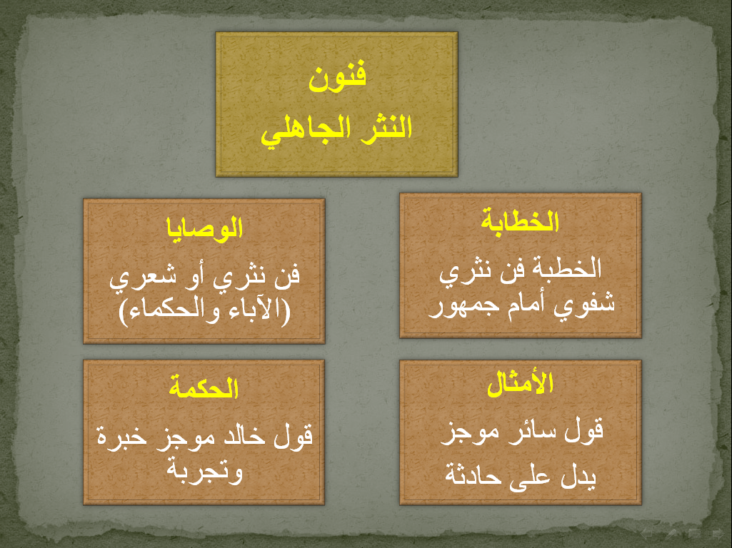النثر في العصر الجاهلي. ١٧ ٤١ ٣١ مايو ٢٠٢٠ ذات صلة. ويشمل الادب في العصر الجاهلي فن ي القول. التنغيم الموسيقي بين الجمل وكان ذلك من أهم خصائص النثر الجاهلي. النثر في الجاهلية موسيقي كالشعر تتخل له أحيان ا جمل موزونة مسجعة يأتي بها البدوي دون تكلف وأكثر الجمل قصيرة موجزة فيها قوة وبلاغة تعبير ويمكننا أن نجد أمثلة للنثر الجاهلي في بعض ما وصل إلينا من الخطب والأمثال ولكن هذه الأمثلة على قلتها لا تكفي وحدها لإبداء.