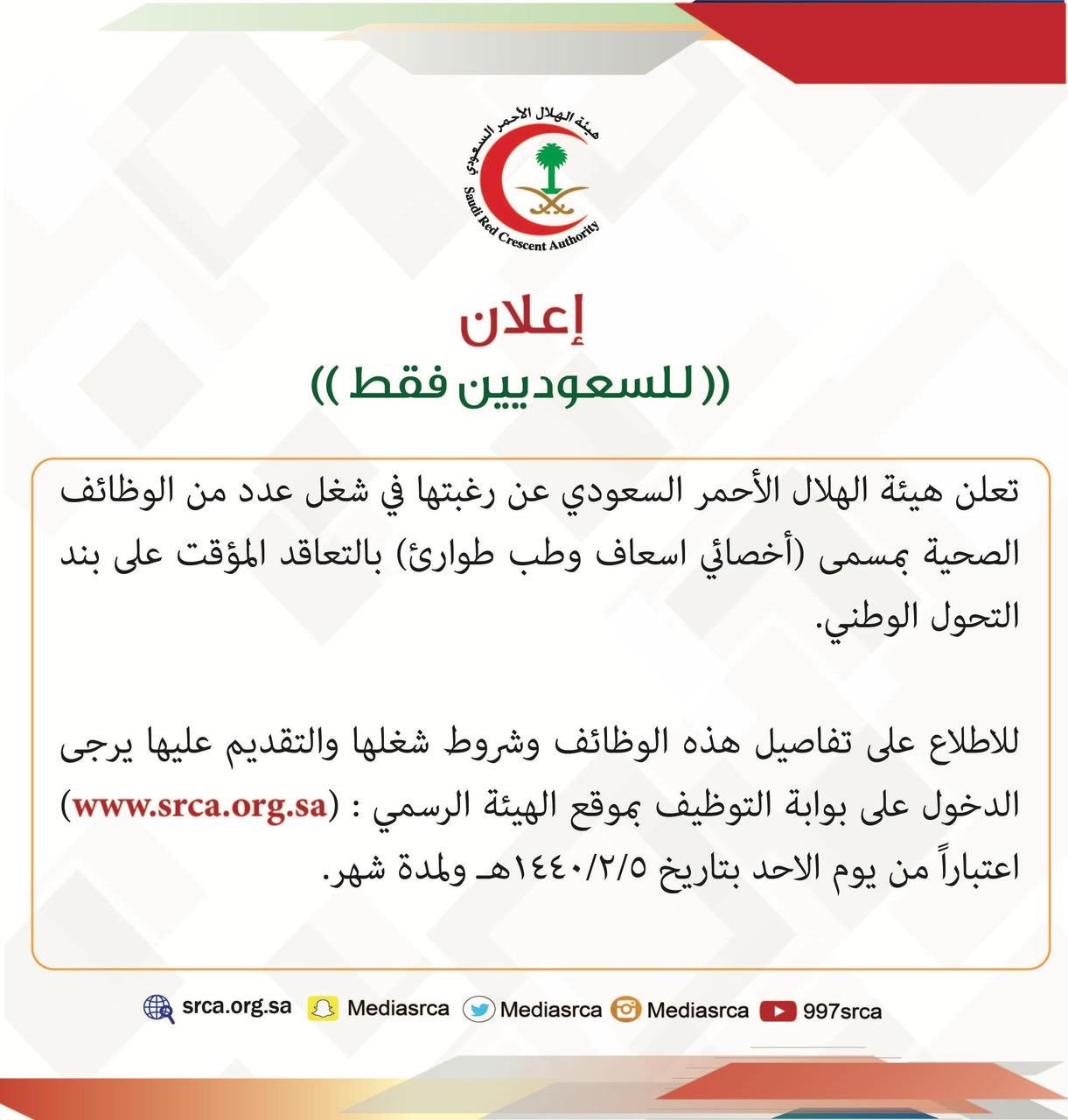 الهلال الاحمر السعودي توظيف. تعلن هيئة الهلال الأحمر السعودي عن حاجتها الي شغل وظائف صحية شاغرة بجميع مدن المملكة بالتعاقد المؤقت على بند التحو ل. وظائف الهلال الاحمر السعودي الهلال الاحمر توظيف وظائف حكومية وظائف صحيه 1441 وظائف اليوم. أعلنت هيئة الهلال الأحمر السعودي فتح باب التوظيف للوظائف الصحية للعمل بمسمى أخصائي إسعاف وطب طوارئ والمشمولة بلائحة الوظائف الصحية على الخدمة المدنية وذلك وفقا للمواعيد وطريقة التقديم الموضحة أدناه. هيئة الهلال الاحمر وضعت مجموعة من الشروط اللازم توافرها في المواطنين المؤهلين والراغبين في شغل الوظائف التي تم الإعلان عنها من قبل الهيئة السعودية.