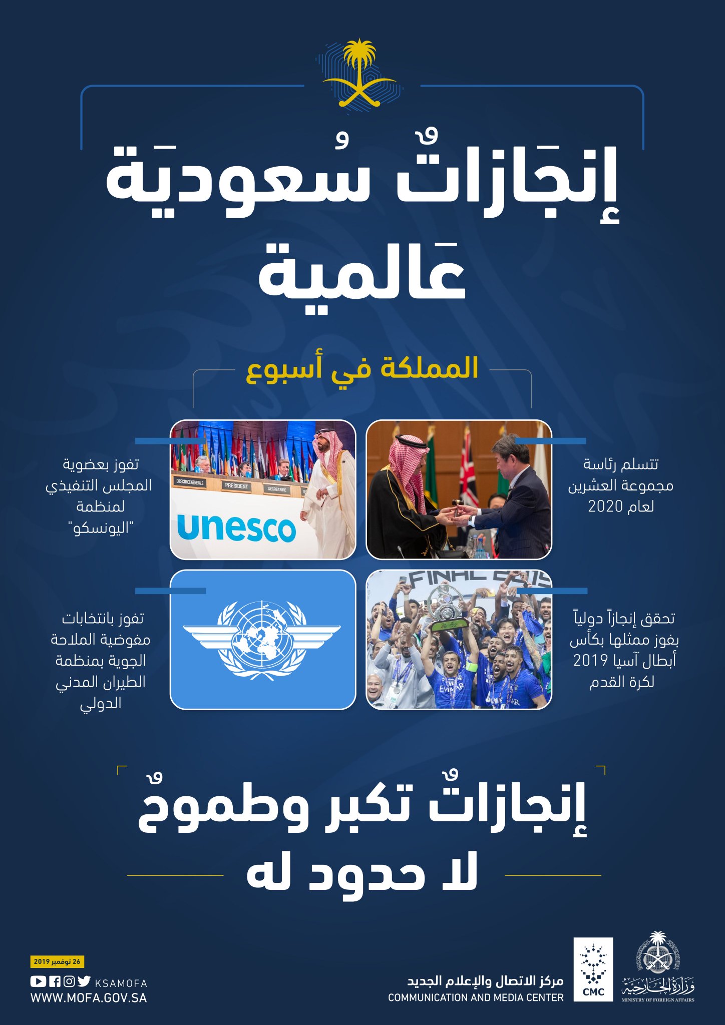 إنجازات المملكة العربية السعودية كثيرة ولا يمكن حصرها منذ توحيد المملكة في عام 1932 حرص الملوك ممن تولوا قيادتها على تحقيق العديد من الإنجازات التي تضع المملكة في مصاف الدول المتقدمة ولم تقتصر النجاحات التي تم تحقيقها على مجال. تحتفل السعودية بيومها الوطني كل عام هذا اليوم الذي تثبت فيه للعالم أجمع انتصارها على كل التحديات التي واجهتها والعقبات التي تخطتها لتصل إلى سلم الدولة الأكثر رقيا بشعبها. البوابة الخارجيه لوزارة الماليه بالمملكة العربية السعوديه إنجازات 2019 قد تحاول الوصول إلى هذا الموقع من مستعرض آمن موجود على الخادم. إعفاء العاملين الأجانب من الرسوم.