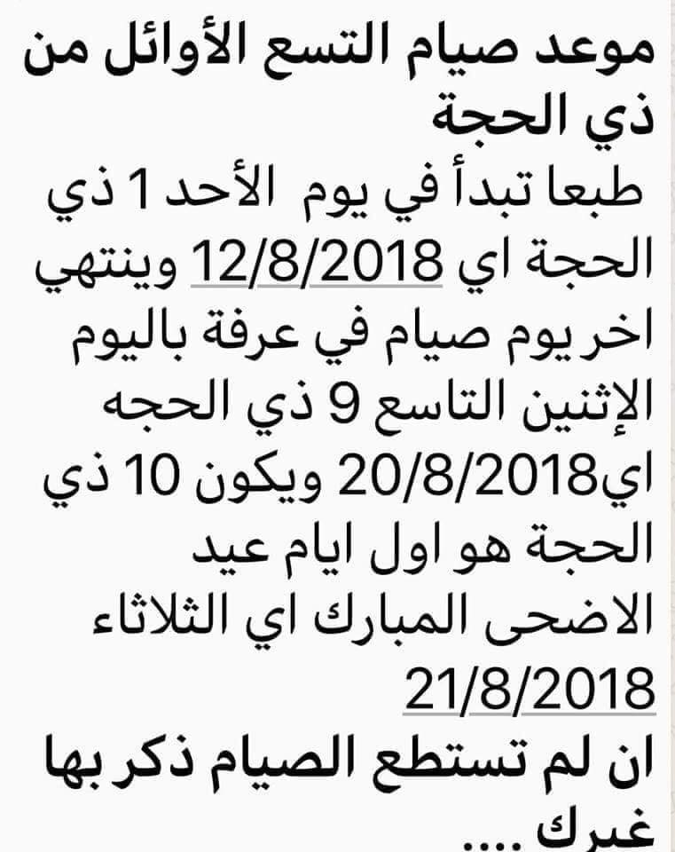 اول ذي الحجة 2018. تبدأ السنة الهجرية بشهر محرم يتبعه سفر ثم ربيع الأول ثم ربيع الثاني ثم جماد الأول ثم جماد الثاني ثم رجب ثم شعبان ثم رمضان ثم شوال ثم ذو القعدة ثم ذو الحجة. اول ايام عيد الاضحى 2018 1439. وبناء على هذه الدراسة سيكون يوم الأحد 11 08 2019م أول أيام عيد الأضحى الم بارك وستتبع الدول العربية والإسلامية المملكة العربية السعودية في بداية شهر ذي الحجة وذلك لارتباطه بموسم الحج. وقفة عرفات 1439 لهذا العام يوم الاثنين الموافق 20 أغسطس وأن بداية شهر ذي الحجة سيكون الأحد الموافق 12 أغسطس 2018 وبذلك يوم إجازة عيد الأضحى المبارك 2018 اعتبارا من يوم وقفة عرفة ولمدة 4 أيام حتى يوم الخميس.