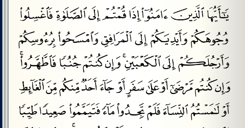 013585 يا أيها الذين آمنوا إذا قمتم إلى الصلاة فاغسلوا وجوهكم وأيديكم إلى المرافق وامسحوا برءوسكم وأرجلكم إلى الكعبين وإن كنتم جنبا فاطهروا وإن كنتم مرضى أو على سفر أو جاء